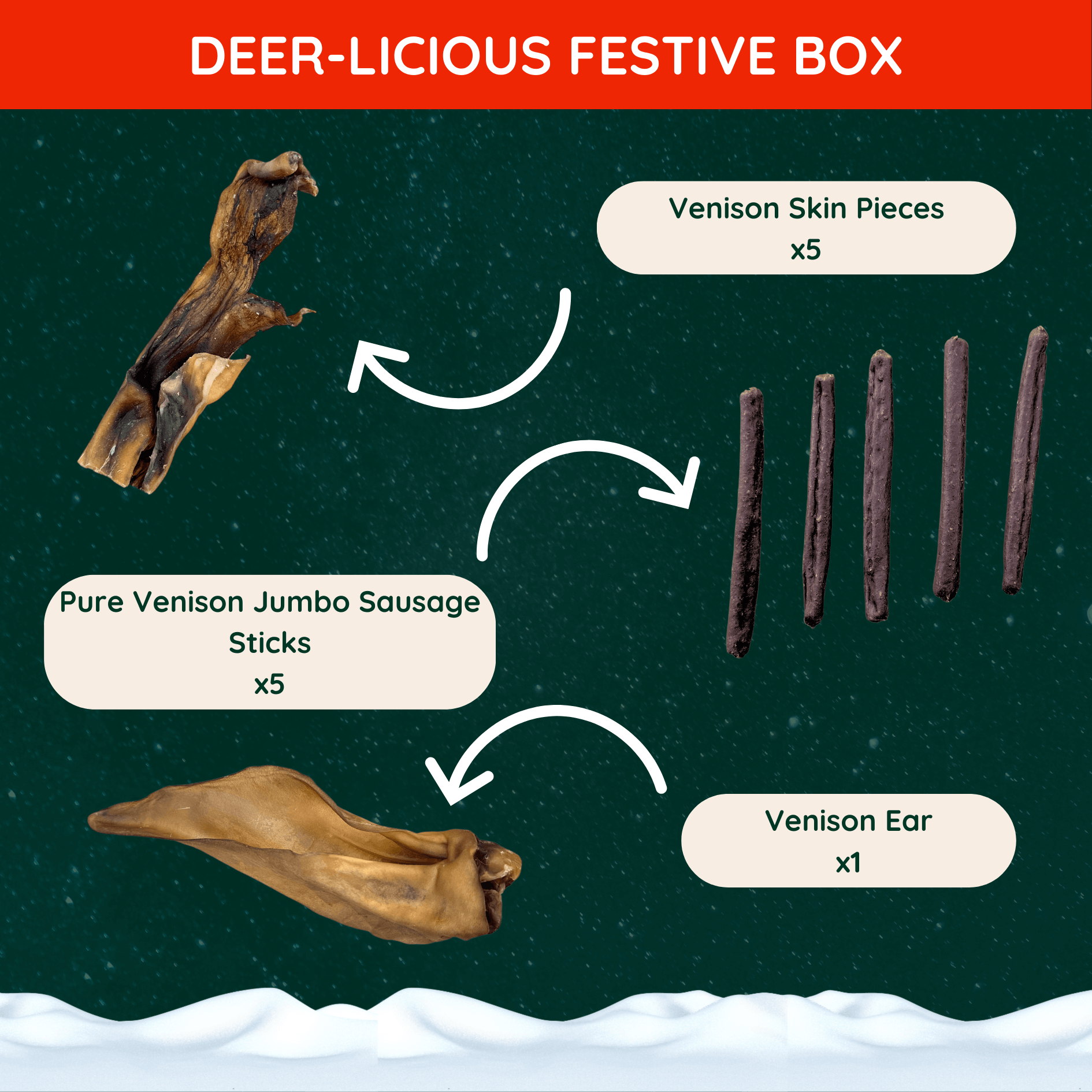A festive all-venison celebration — perfect for dogs who adore rich, gamey treats and owners who prefer clean, single-protein simplicity.