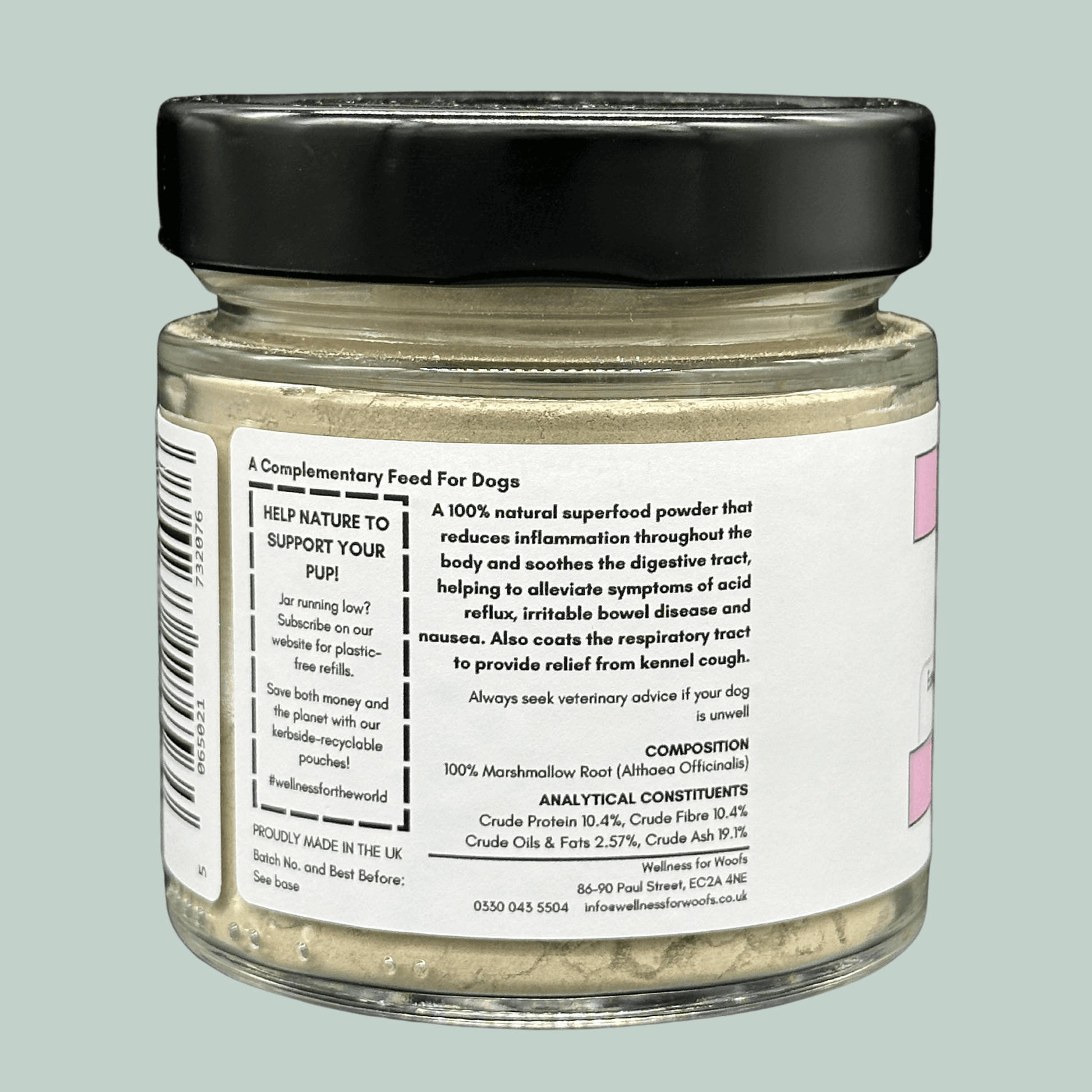 Crafted with care in the UK, Wellness for Woofs Marshmallow Root Powder is made from human-grade ingredients, ensuring the highest standards of quality and safety for your beloved pet. Containing no artificial additives or fillers, it’s a pure and natural solution to your dog’s digestive needs.