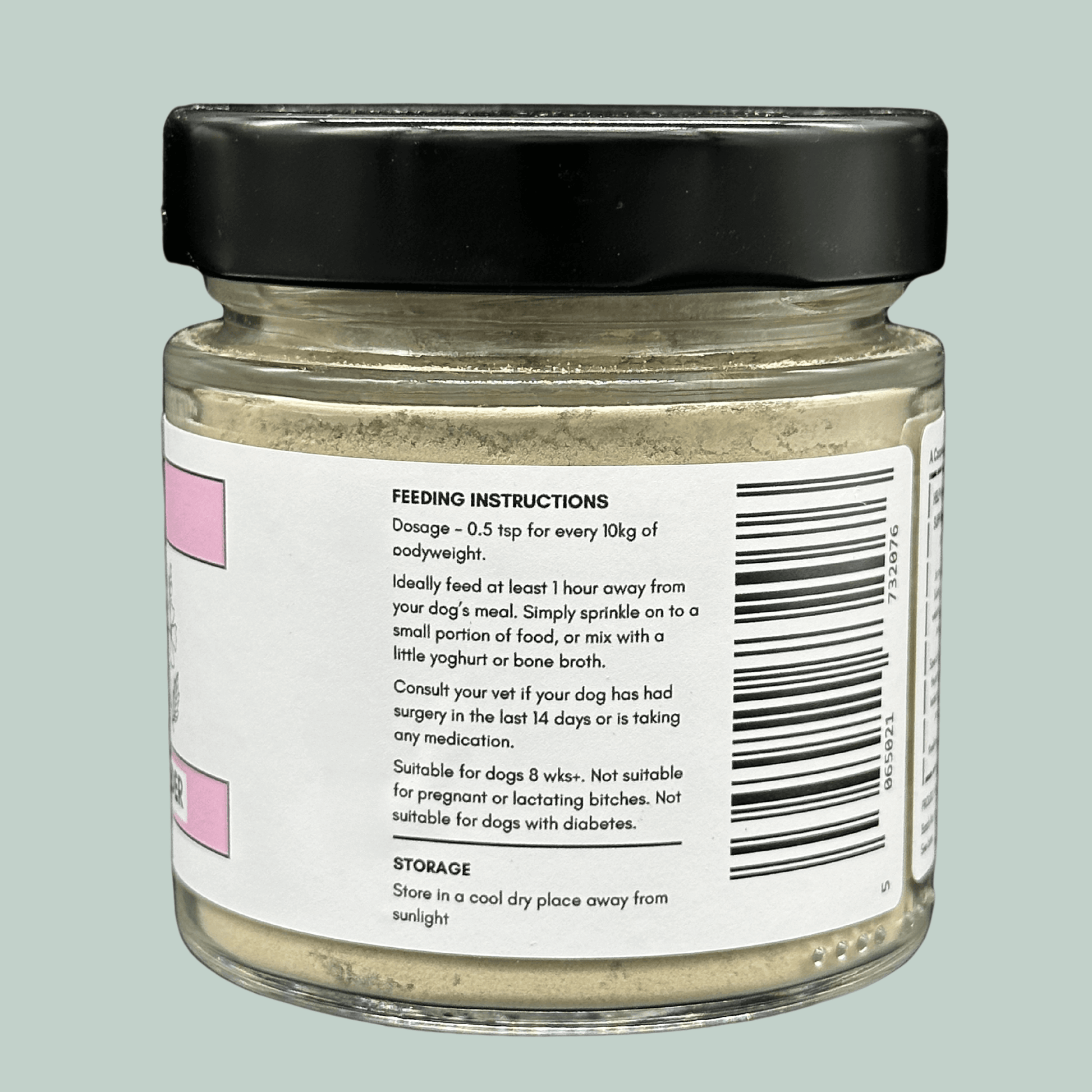 Wellness for Woofs Marshmallow Root Powder (100g) – a 100% natural superfood powder that supports digestive health and provides gentle relief from common stomach issues. Perfect for dogs with sensitive stomachs or occasional digestive upsets, this soothing botanical works from the inside out to keep your furry friend happy and comfortable.