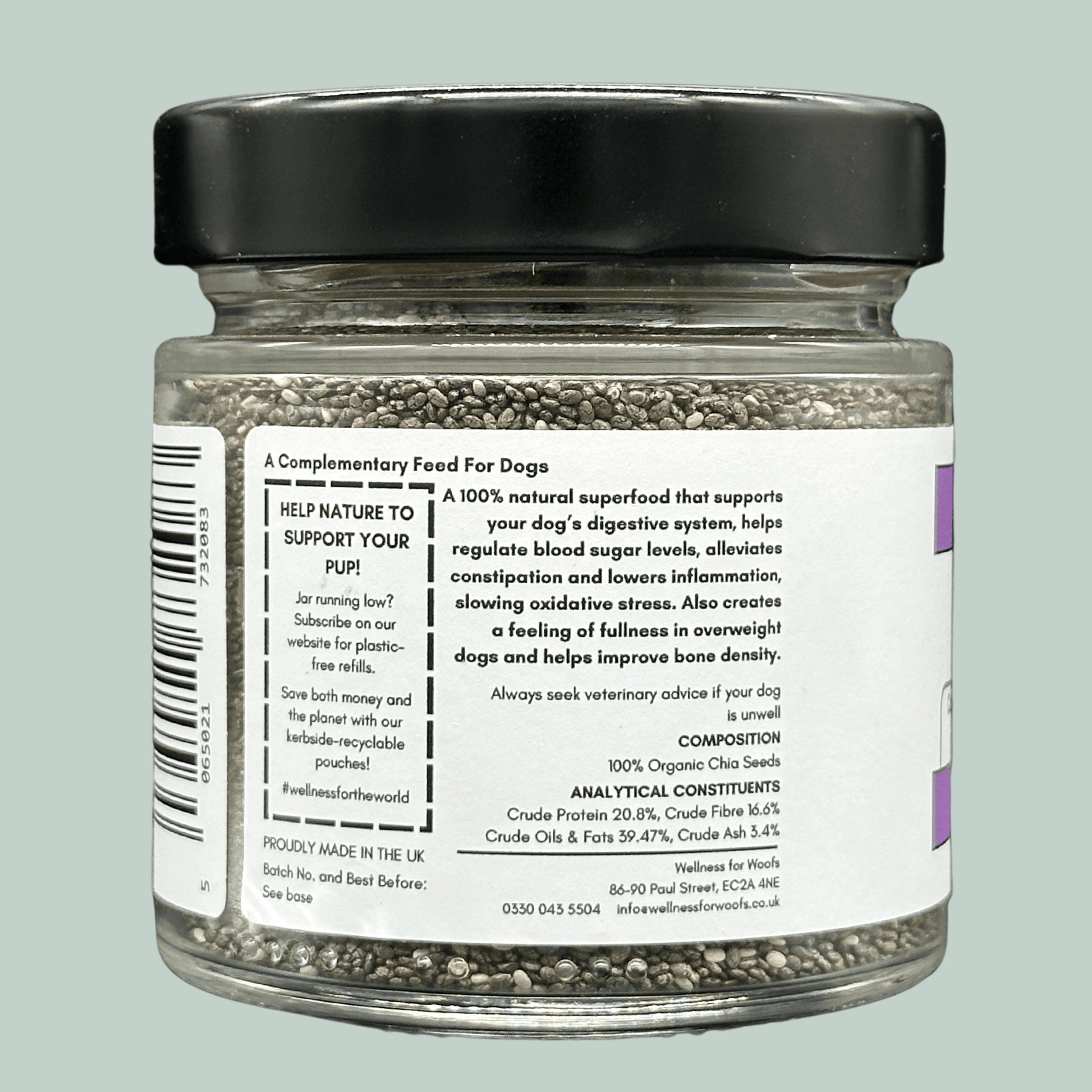 Crafted in the UK with care, Wellness for Woofs Organic Chia Seeds are the perfect addition to your dog’s diet, supporting their health and happiness naturally. Treat your beloved pet like the family member they are - with high-quality, sustainable nutrition that keeps them thriving.